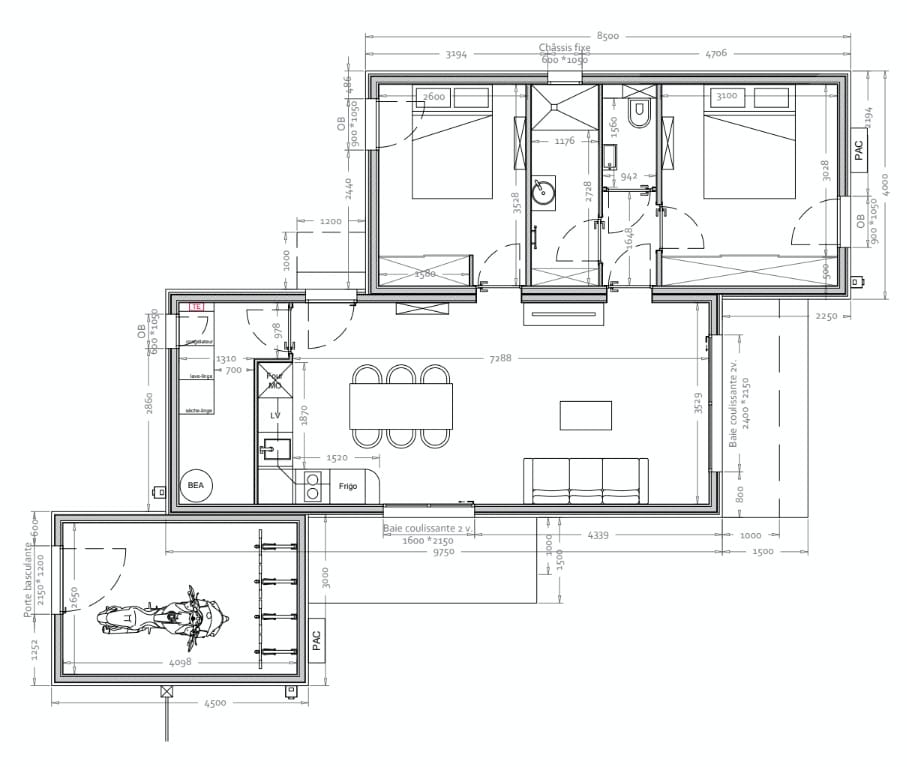 Pour ce projet modulaire de 68 m² à La Pommeraye (49), nous avons d’abord élaboré les plans 2D : organisation des 2 chambres, salle de bain, cuisine, pièce de vie et garage. Cette étape garantit une implantation optimale et une circulation fluide dans chaque espace.