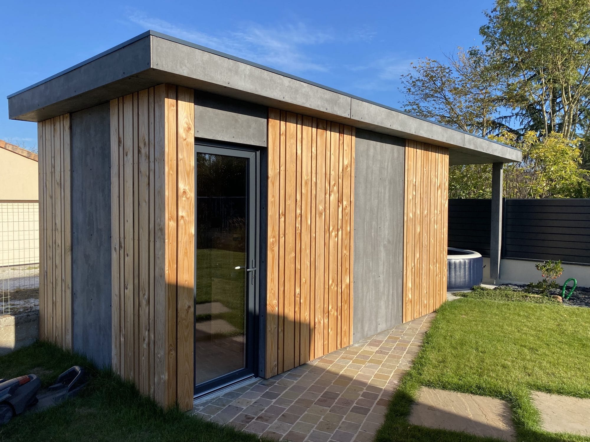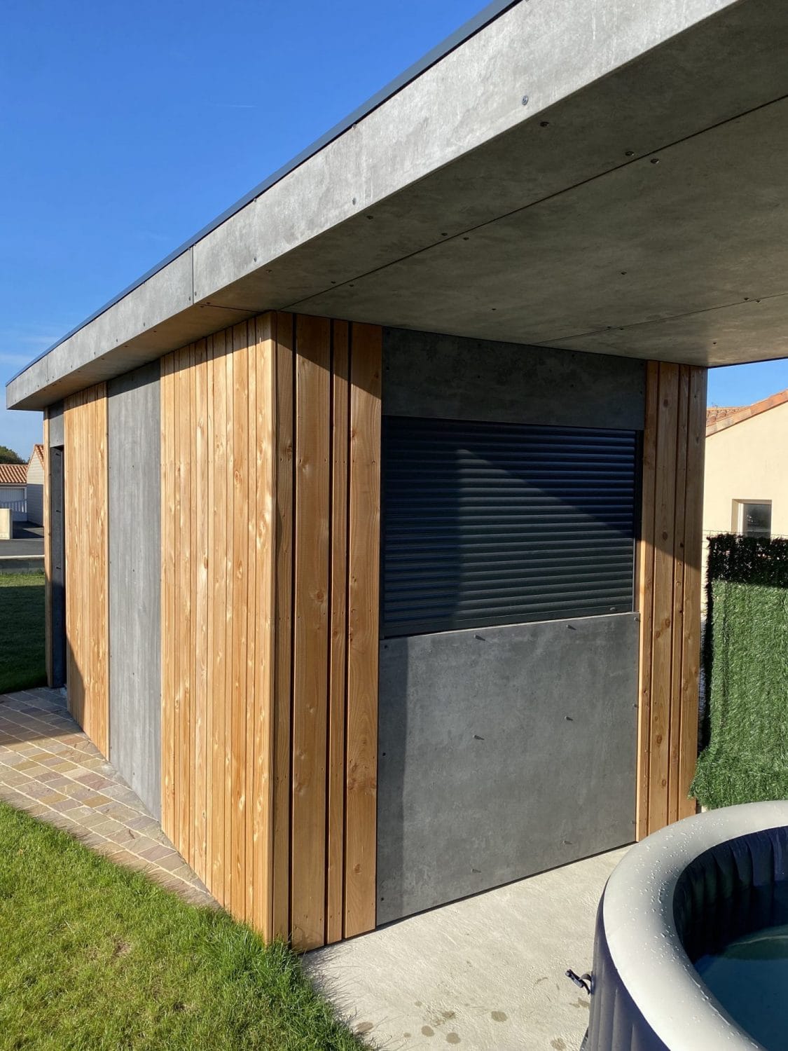 WoodVolum a réalisé un Pool house de 12m2, notre client pourra profiter de cet espace en plus pour la machinerie de son jacuzzi, ranger ses affaires d’esxterieur, il pourra également profiter de cette superbe pergola pour se baigner à l’abri du soleil.